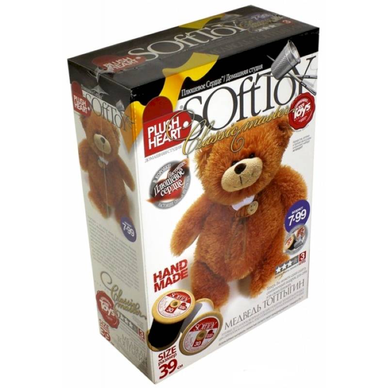 В комплект набора входит: пошитая голова игрушки, 4 лапы, хвост, 2 детали туловища, бантик в клеточку, синтепоновая набивка, капроновый мешочек с полигранулами, нитки и 'Плюшевое сердце'.