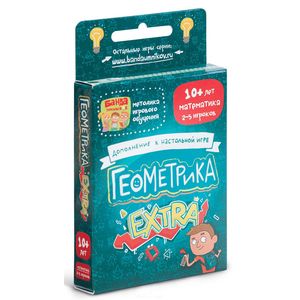 Геометрика EXTRA — набор дополнительных карточек к базовой игре «Геометрика», который включает более сложные геометрические понятия, новые фигуры и экшн-карты. Карты дополнения предназначены для использования совестно с базовой игрой, они разбиты на три уровня сложности и их можно вводить в игру поэтапно.