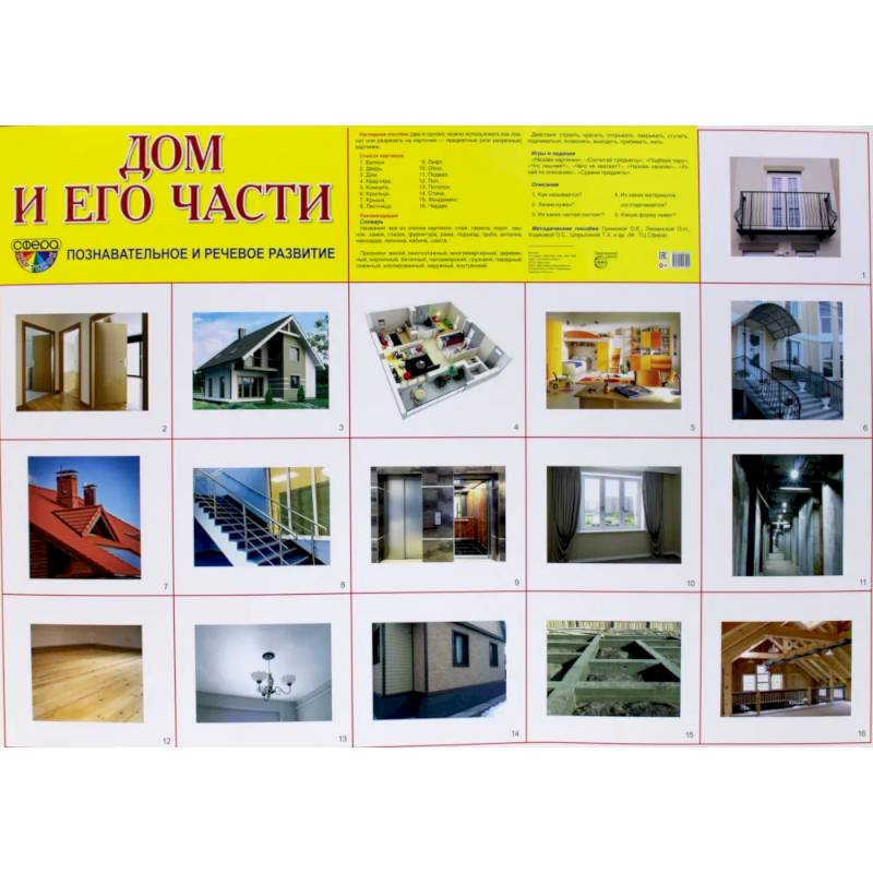 Комплект состоит из:  1. Демонстрационный плакат А2. Дом и его части.  2. Демонстрационный плакат А2. Игрушки.  3. Демонстрационный плакат А2. Инструменты.  4. Демонстрационный плакат А2. Посуда кухонная.  5. Демонстрационный плакат А2. Посуда столовая.  6. Демонстрационный плакат А2. Электроприборы.