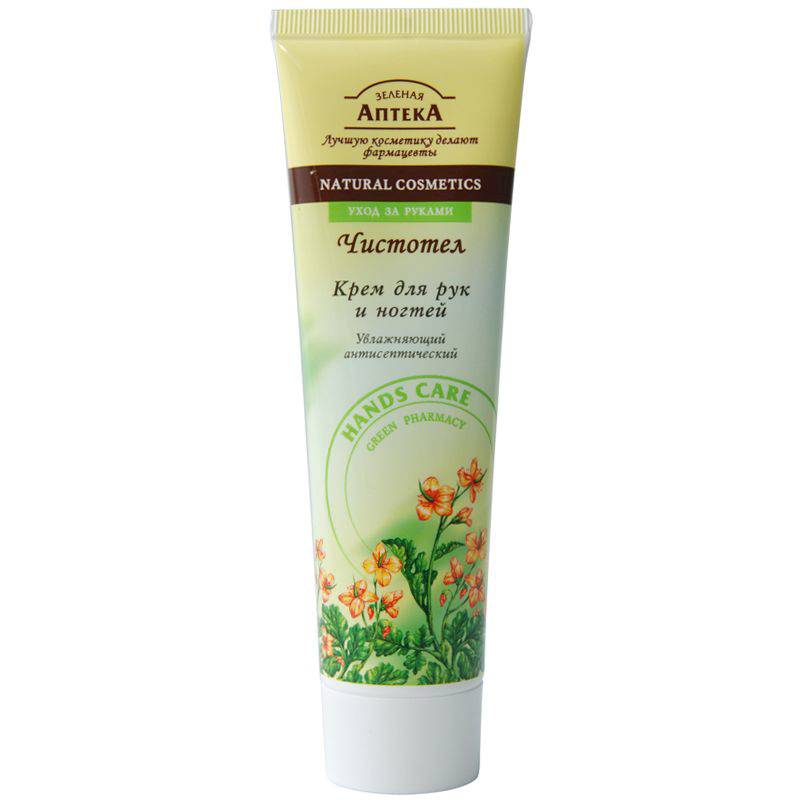 Приятный крем устраняет шероховатость, увлажняет кожу рук, делает её мягкой и гладкой, не оставляет ощущения жирности. Содержит чистотел, который издавна используется для лечения кожных заболеваний и обладает бактерицидным и регенерирующим действием. Введенный в состав крема аллантоин регенерирует, успокаивает кожу, уменьшает ее склонность к покраснению. Кератин и витамин В5 эффективно укрепляют структуру кожи, предупреждают ломкость и расслоение ногтевых пластин. Сочетание витаминов А и Е активизирует процесс регенерации клеток, продлевает молодость. Масло облепихи и подорожник смягчают, ускоряют процесс заживления мелких повреждений кожи. Арника улучшает кровоснабжение и способствует впитыванию полезных веществ. Обладая богатейшим составом, крем идеально ухаживает за кожей рук и ногтями, дарит ей нежную шелковистость.[  ]Препарат действует быстро и надежно - прекрасно впитывается и усваивается, проникая глубоко в клетки кожи. [  ]Способ применения: наносить легкими массирующими движениями на чистую, сухую кожу.